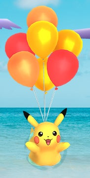 Pikachu mit rotem, gelben und orangefarbenen Luftballons fliegende Pikachu Air Adventures Event (Mai 2022) – Aus zeitgesteuerter Forschungsquest, Feldforschung und in freier Wildbahn