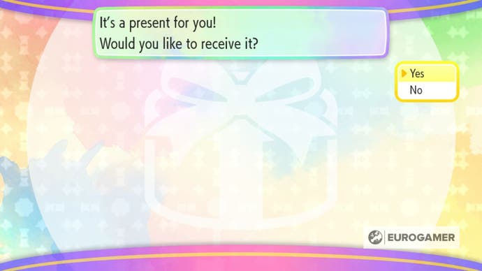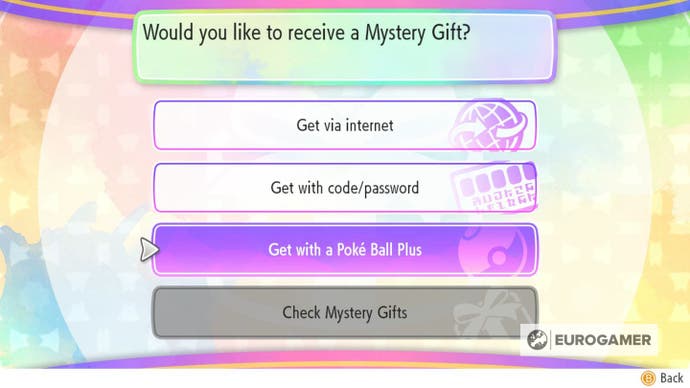 3. Wählen Sie mit einem Poké -Ball -Plus -ROM das Mystery -Geschenkmenü, und nehmen Sie dann die beiden Eingabeaufforderungen dazu an, ob Sie es empfangen möchten und ob es in Ordnung ist, sich mit dem Internet zu verbinden.
