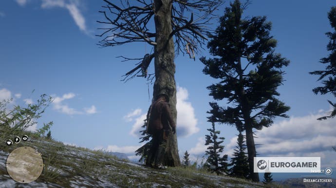 Nördlich von Lonnies Hütte ist dieser Traumfänger ein weiterer etwas schwieriger zu finden. Dieser ist zwischen dem Gebüsch versteckt und Sie müssen nach Nordwesten des Weges des Weges gehen “L” in Lonnies Hütte, um es zu finden. Haben Sie keine Angst, im Gebüsch zu waten, um diesen Traumfänger zu finden. Verwenden Sie die üblichen Methoden von Deadeye in der Nähe des Punktes, den wir auf der Karte hervorgehoben haben.