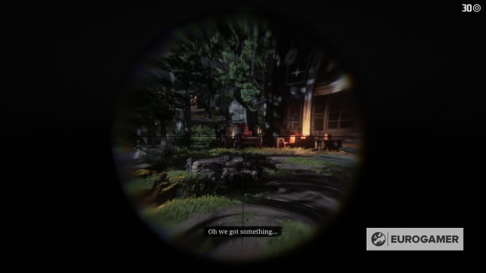 Ein oder zwei könnten sich nähern, aber sonst hängen Sie sich einfach zurück. Wenn Sie Probleme haben, etwas zu erkennen, achten Sie auf das Rot des Retikulums, um Sie zu unterstützen. Und wenn der Maschinengewehrschützer auf dem Balkon erscheint, zielen Sie direkt darüber, um die Person zu töten, die Manning.