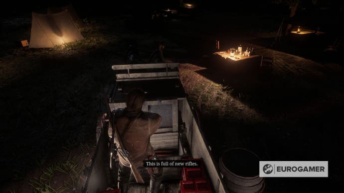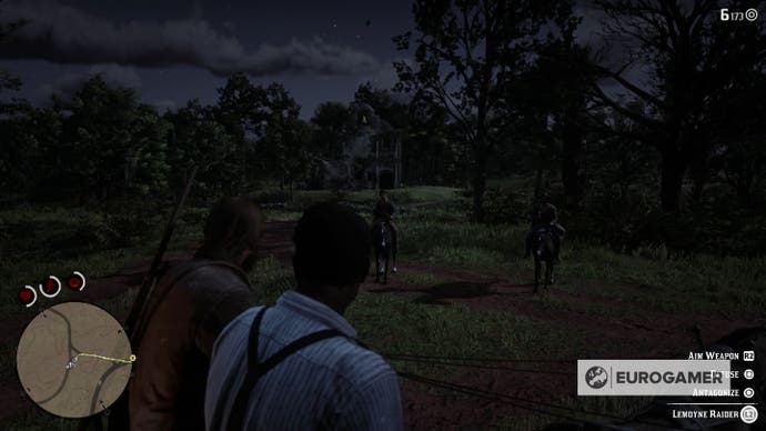Von hier aus vergewissern Sie sich, dass Sie das Rolling -Block -Scharfschützengewehr von Ihrem Pferd haben und am Tor abdecken (drücken Sie R1 oder rechte Stoßfänger). Von hier aus können Sie die Immobilie vor uns herausholen. Wenn Lenny Sie auffordert, etwas Nützliches zu finden, schauen Sie sich links von der Eigenschaft nach einem mit Dynamit gefüllten Wagen an.