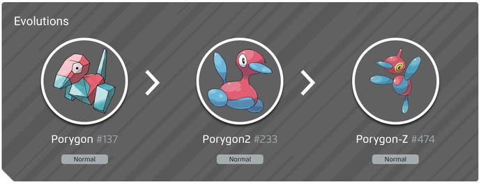 Porygon entwickelt sich zu Porygon2 mit 25 Porygon Candy und einem Upgrade – ein transparentes Gerät, das bestimmte Arten von ergeben kann Pokémon entwickeln ‚. Spoiler -Warnung: Es funktioniert nur auf Porygon.
