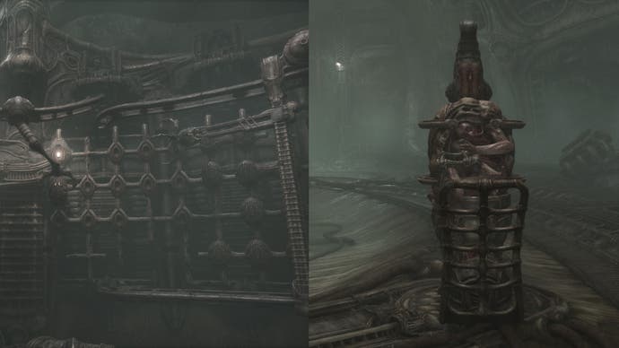 Für den ersten Schritt zur grausamen Methode lassen Sie’s Richten Sie den Weg zum Ei auf’S Tod. Gehen Sie zur Spiralstruktur in der Mitte des Erdgeschosses im Hauptraum und interagieren mit der Panel. Ändern Sie die Schienenplatzierung So führt es mit dem außerirdischen Stuhl und dem kleinen Kran in den Raum (der mit dem kreisförmigen Aufzug).