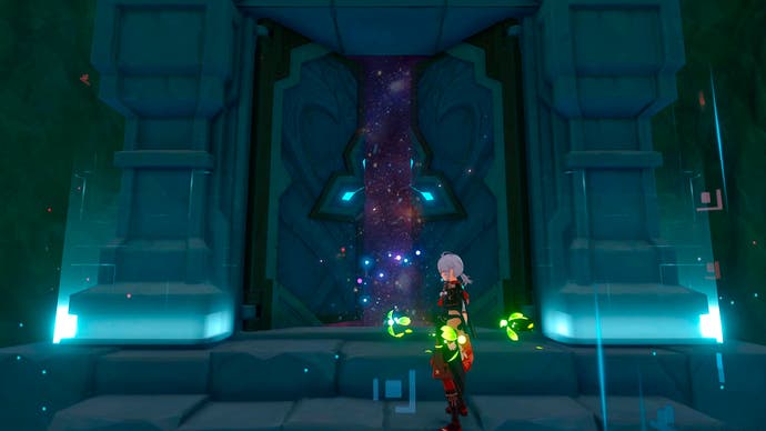 Folgen Sie dem Pfad und verwenden Sie dann den Vier-Blatt-Sigil, um einen anderen Teil des Raums zu erreichen. Sie finden ein Totem im unteren Teil dessen, wo Sie sich befinden. Schlagen Sie es mit einer Dendro -Fähigkeit. Nach diesem Kopf zu Ihrer rechten sehen Sie ein kleines Banditcamp vor einer Tür, die von einem grünen Feld verschlossen ist. Zum Betreten müssen Sie die Wand auf der linken Seite der Tür nach oben klettern, bis ein kleines Loch. Schlagen Sie im Bereich das Totem, um das Feld zu zerstreuen.