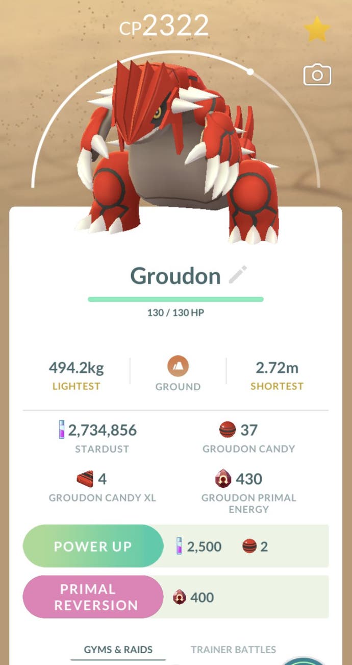 Es kostet Ihre 400 ursprüngliche Energie, um erstmals eine ursprüngliche Umkehrung auf einem Groudon oder Kyogre durchzuführen.