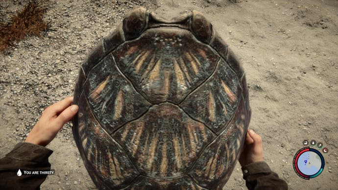 Stöcke befinden sich normalerweise auf dem Boden in der Nähe von Bäumen, aber Sie müssen an den Stränden auf die Jagd gehen und eine Schildkröte töten, um ihre Hülle zu bekommen. Wir fanden eine große Gruppe von Schildkröten am westlichen Strand, der sich in der Nähe der Pistole befindet.