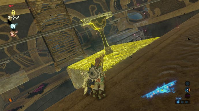 Erstens ein paar weitere optionale Truhen. Schießen Sie das Auge auf die Decke, um einen mit Eispfeilen fallen zu. Wenn Sie eins im Fenster stehen, um etwas Höhe zu erlangen.