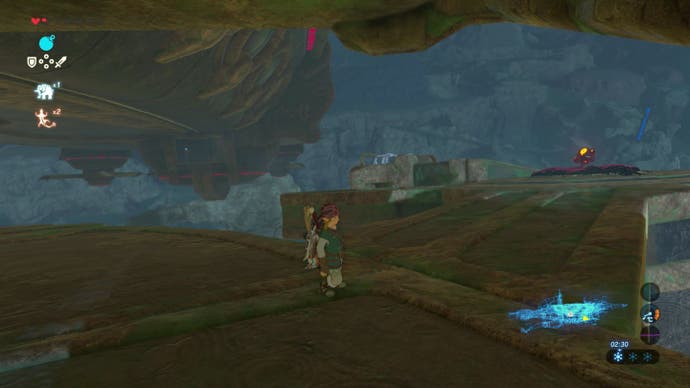 Lassen Sie uns zunächst ein paar Truhen holen. Wenn Sie von dieser Seite auf die höhere Kante fallen, finden Sie einige Bombenpfeile in der Ecke, dann zerstören Sie das Auge direkt auf der Brust für einen alten Schaft.