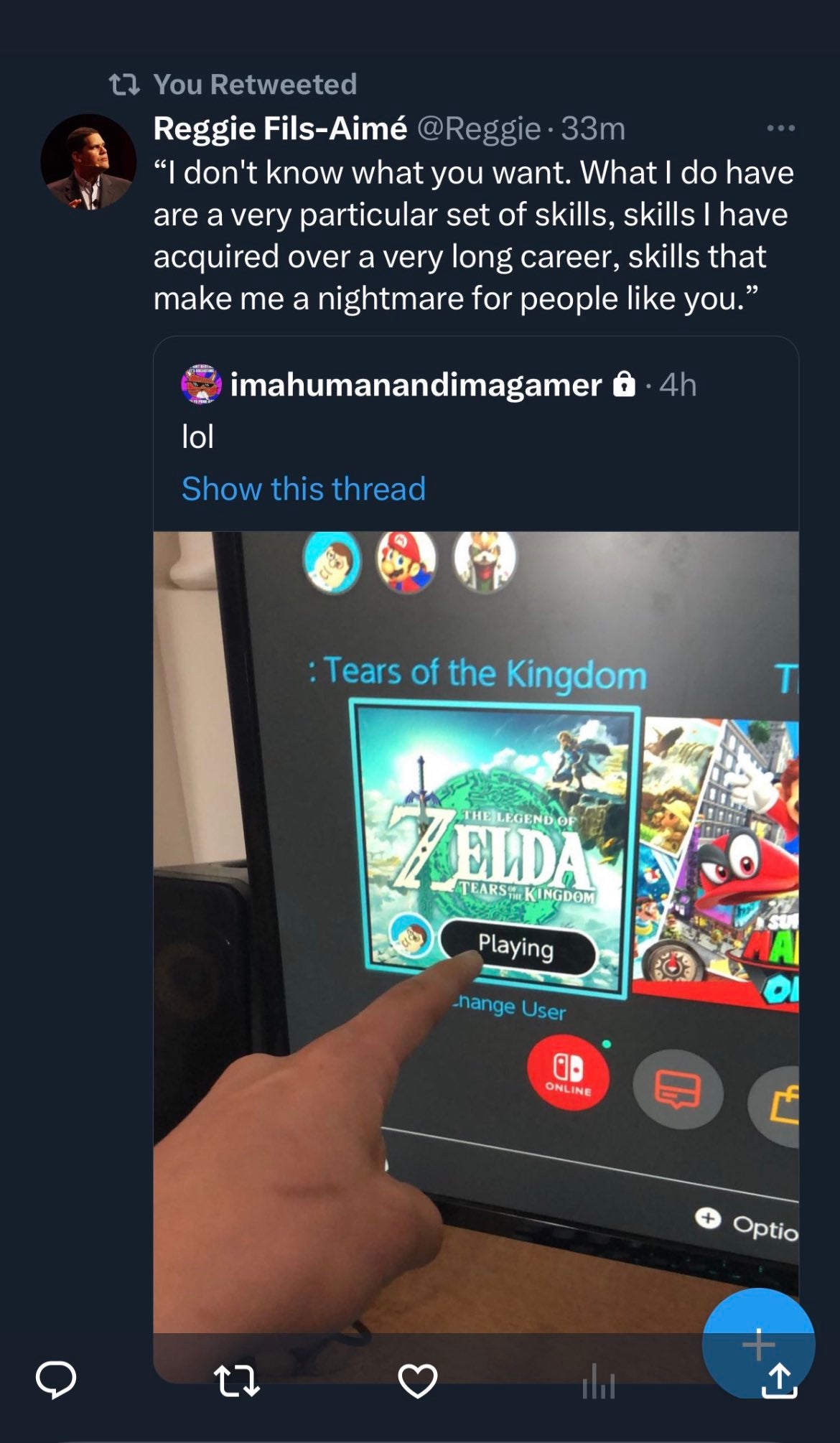 Als Antwort auf einen Twitter -Benutzer, der ein Bild ihres Switch -Startbildschirms gemeinsam nimmt, das hatte The Legend of Zelda: Tears of the Kingdom stellten sich und bereit zu spielen (vermutlich mit unehelichen Mitteln, aber ich kann nicht sicher sagen), das Alum von Nintendo of America, indem er seinen Muskeln durch Zitieren des Neeson-Spargepots entschiedActionfilm genommen.