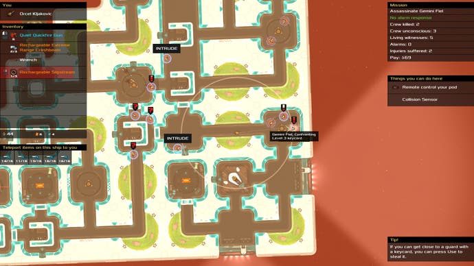 Ihr bester Freund oder so ist die Space-Leiste, die die Zeit verpasstTeleportieren zu Ihrer Position, während Sie eine Wachpistole hacken. Das Spiel verlangsamt auch die Zeit, wenn Sie in den Visionsbereich eines bewussten Feindes eintreten und Ihnen ein paar kostbare Sekunden gewährt, um die Sichtlinie zu brechen, bevor eine Warnung ausgelöst wird.