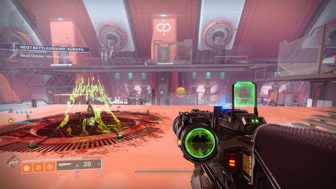• Die nächste Drohne befindet sich im Scharlach. Gehen Sie den langen Eingang und zielen Sie weiter geradeaus. Die Drohne befindet sich im hinteren Teil dieses ersten Bereichs, leicht erhöht.