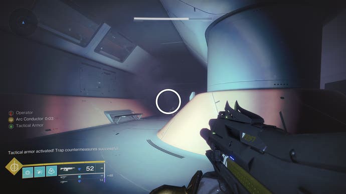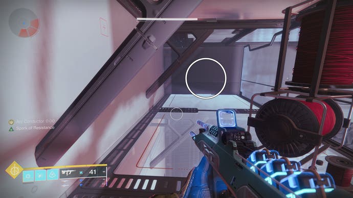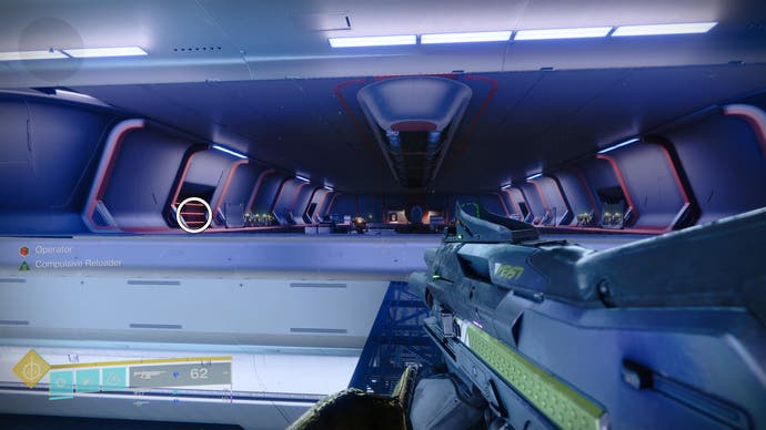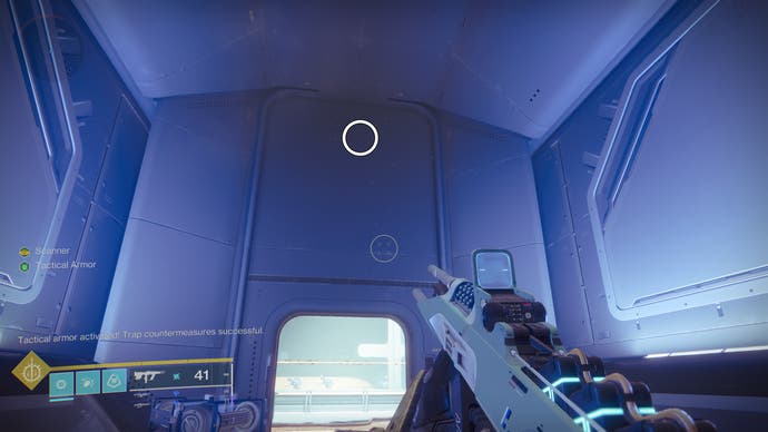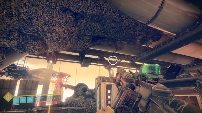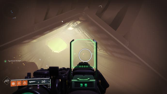 • Bewegen Sie sich weiter vorwärts, bis Sie einen außergewöhnlich großen und langen Raum erreichen. Normalerweise steigen Sie über ein Loch im Boden eines Gehwegs in die unteren Ebenen ab, aber Don’T betreten Sie es sofort. Freuen Sie sich stattdessen nach vorne und links in der Nähe der Decke der unteren Ebene. Es’s subtil, aber Sie sollten die nächste Sicherheitsdrohne hier sehen.