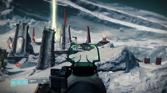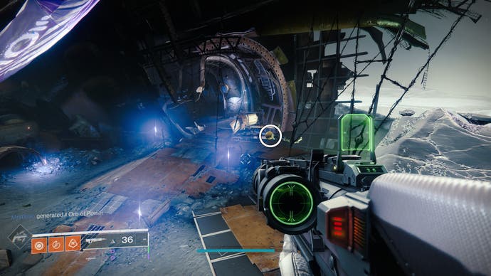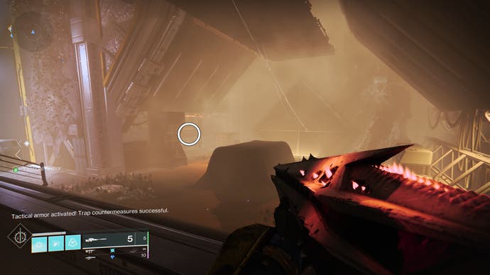 • Schauen Sie nördlich der Eventide -Ruinen schneller Reisepunkt, um den roten Schein eines bombardierten Gebäudes zu sehen. Gehen Sie geradeaus hinein und finden Sie die Luke, die sich während des Tiefenkrypta -Überfalls öffnet. Die Drohne ist nur nach links.