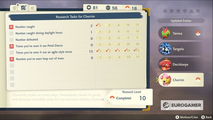 Sobald Sie dies getan haben, sollten Sie bereits ein paar Forschungsaufgaben für Cherrim erledigt haben. Gehen Sie jetzt einfach herum und verprügeln Sie einige schwache Monster mit einem agilen Stil, wir empfehlen, Bidoof absorbieren, und Sie sollten in der Lage sein, den Eintrag zu beenden.