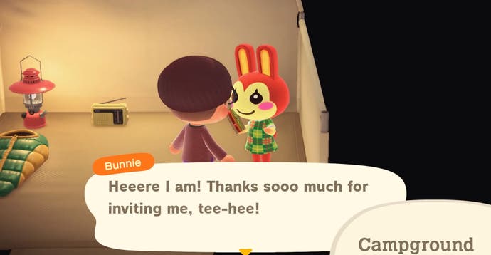 Dieser Dorfbewohner erscheint dann im Zelt auf dem Campingplatz, wo Sie mit ihnen interagieren können.