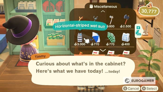 Um diesen Kopf zu Ihrer örtlichen Nook zu tun und schauen Sie in den Schrank. Dort finden Sie einen Neoprenanzug, der für 3.000 Glocken verkauft wird.