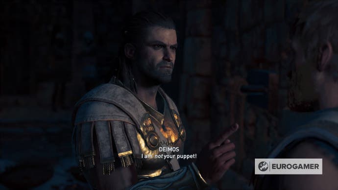 Während Kapitel 3 gehen Sie zu einer Schmiede, in der Sie die Kraft des Speers von Leonidas verbessern werden. Wenn Sie gehen, wird Deimos auf Sie warten. Das folgende Gespräch kann in einen Kampf entarten, da Deimos so instabil ist. Vermeiden Sie dies um jeden Preis, indem Sie die passiven Antworten auswählen, die Sie wiederholen, dass Sie ihn vor dem Kult retten möchten, und stoppen Sie ihre Manipulation von ihm.
