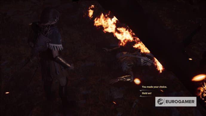 Wenn Sie endlich Nikolaus persönlich (als Teil des Wolfs von Sparta Mission) treffen, zeigen Sie Ihre wahre Identität und verlangen zu wissen, warum Ihr eigener Vater Sie zu Ihrem geworfen hat Doom. Wenn Sie ihn daran erinnern, dass der Kopf auf dem Kopf ist, haben Sie die folgenden zwei Möglichkeiten: „Ich bin gekommen, um meine Rache zu nehmen“ und „Ich bin gekommen, um Antworten zu bekommen“. Wählen Sie die zweite aus, da dies sicherstellt, dass Nikolaus lebt (damit Sie ihm in Kapitel sieben wieder begegnen können).