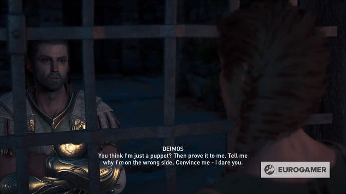 Dies wird dazu führen, dass Deimos mit reagieren “Ich bin nicht deine Marionette!” Als Kleon ihm sagt, er solle gehen. Wenn er dies sagt, wissen Sie, dass Sie einen großen Einfluss auf ihn haben und Ihren Chancen geholfen haben, ein „glückliches“ Ende zu bekommen. Es kann andere Möglichkeiten geben, diese Reaktion von Deimos zu erreichen, aber dies war die, die wir verwendet haben.