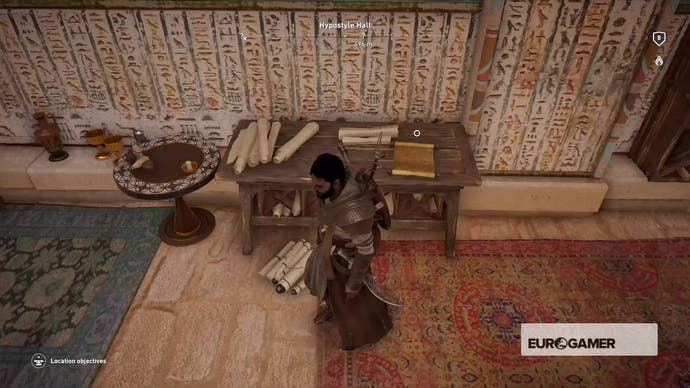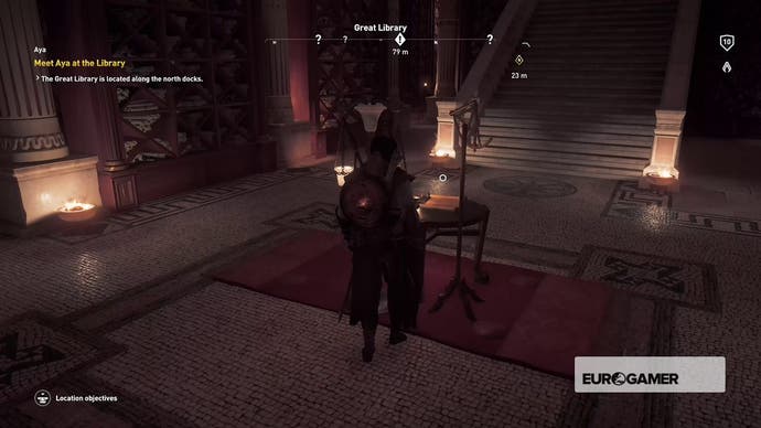 Der Hinweis befindet sich auf einem kleinen Tisch am Fuße der Treppe in der großen Bibliothek in Alexandria.Sie werden während der Eröffnungsstufe der Aya Story Quest daran vorbeigehen.