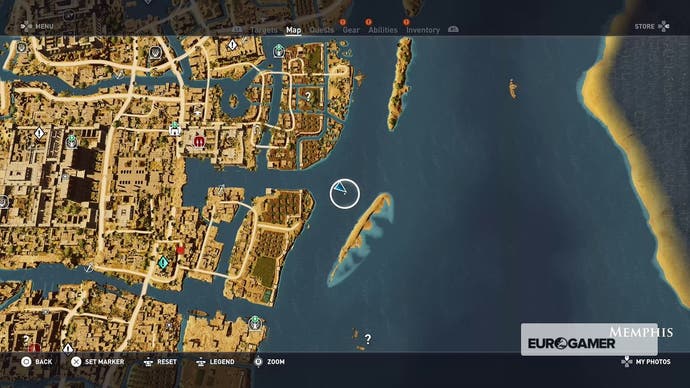 Um den Gegenstand direkt nach Osten zu finden, bis Sie dort ankommen, wo sich der Kanal dem Nil anschließt.Zwischen der südlichen Statue und der Sandbar im Fluss finden Sie ein Schiffswrack, und der Schatz befindet sich auf dem Flussbett ein paar Meter westlich.