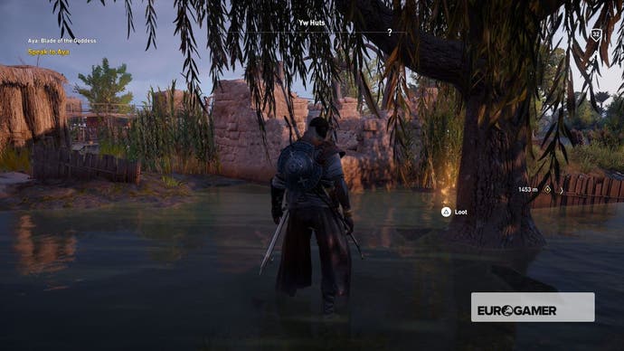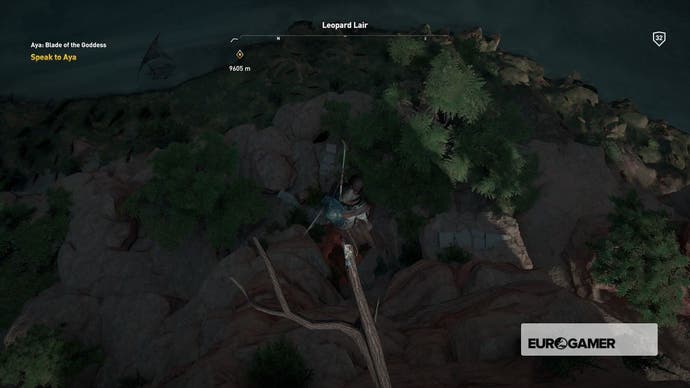 Auf der Südseite des Wassers unter der Spitze von Haueris Nome finden Sie einige Ruinen auf einer Klippe. Machen Sie sich auf den Weg zu ihnen, aber achten Sie auf die Leoparden, die auf Sie warten. Steigen Sie auf den Zweig, der über die Klippe stochert, und machen Sie einen Glaubenssprung in das Loch unten, um den Schatz zu finden. (Sie müssen nicht den ganzen Weg zu den Ruinen klettern und können stattdessen einfach die Klippen unten klettern und in das Loch fallen.)