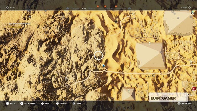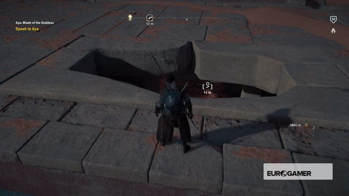 Der Hinweis kann in den Grabkammern östlich der schnellen Reisepyramide gefunden werden. Suchen Sie nach der Kammer mit dem Loch im Dach und fallen Sie nach innen.