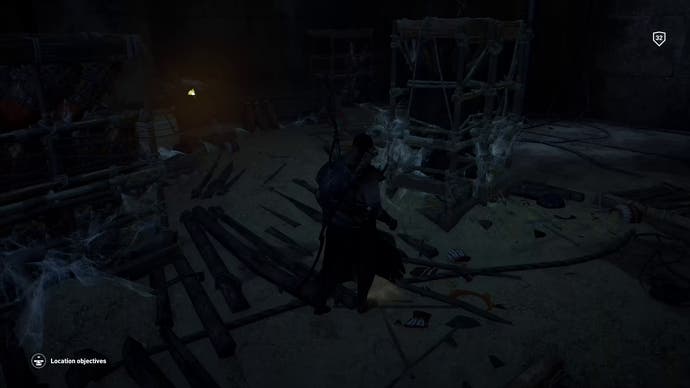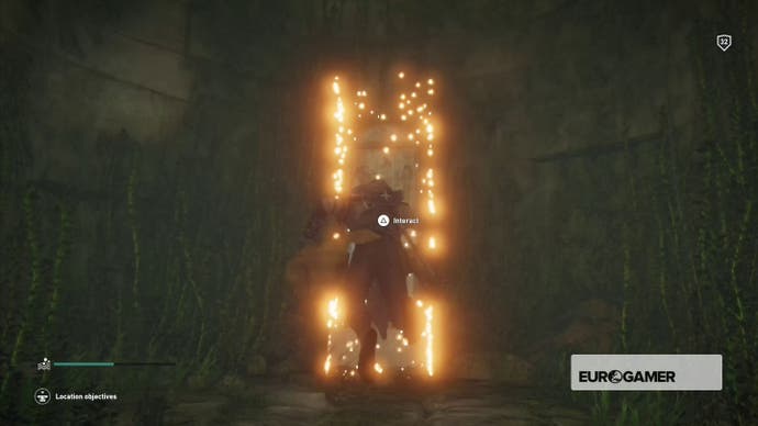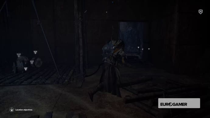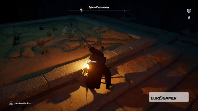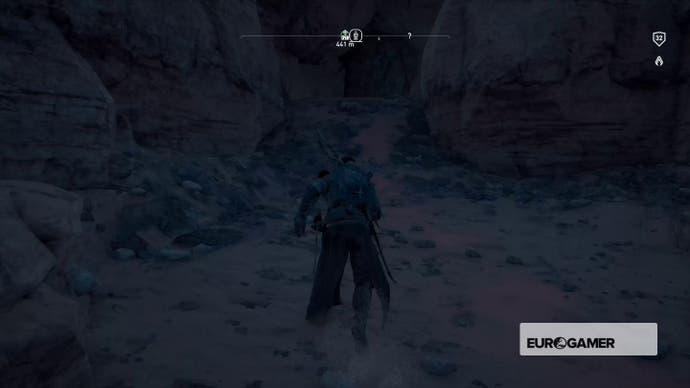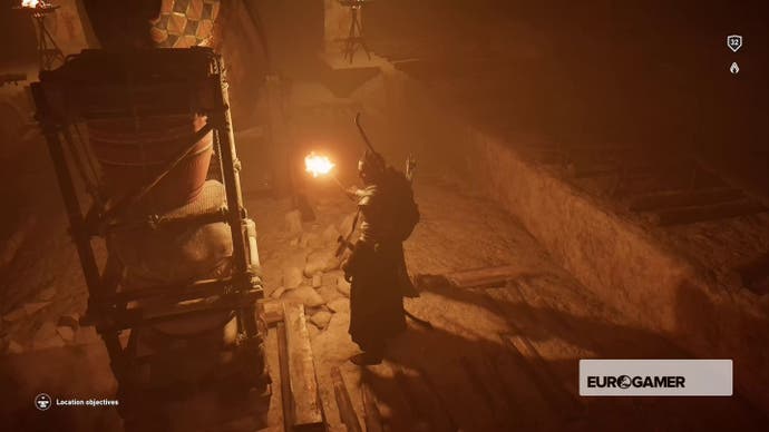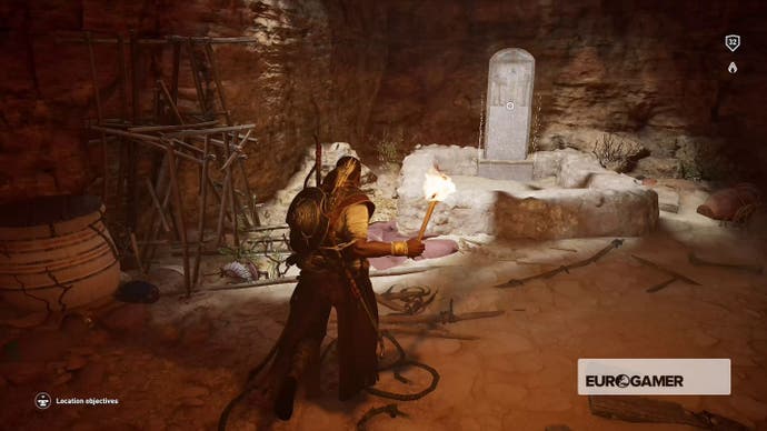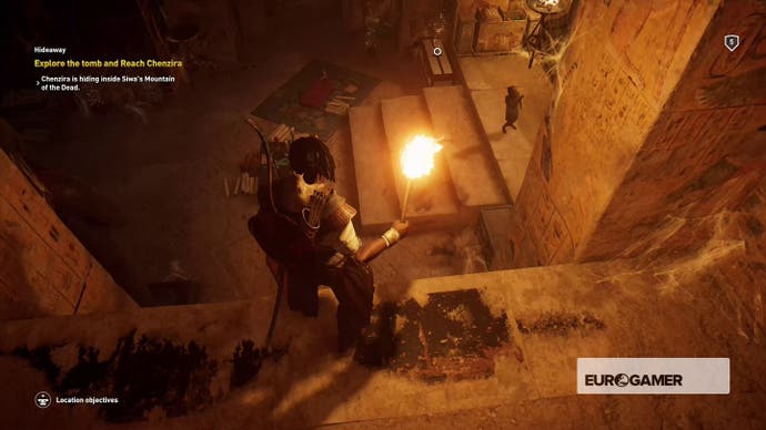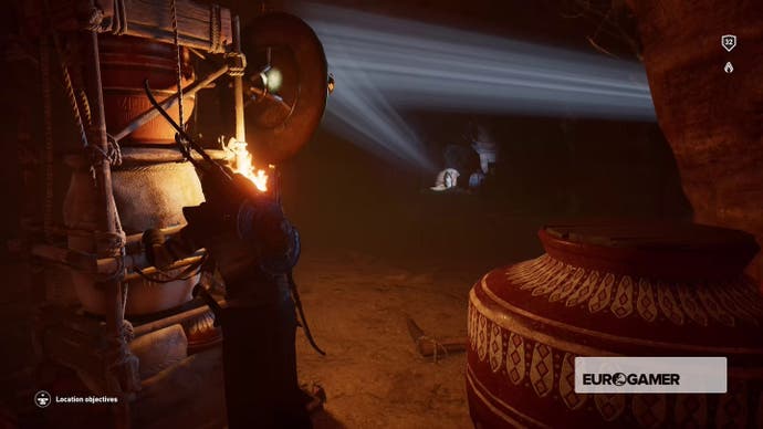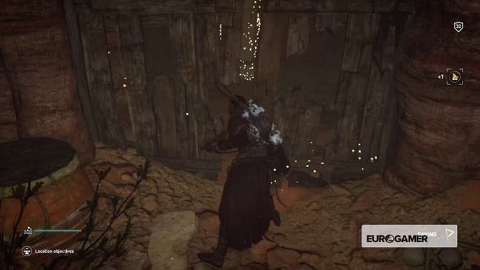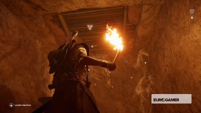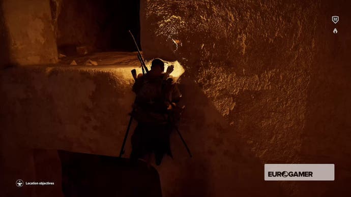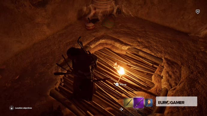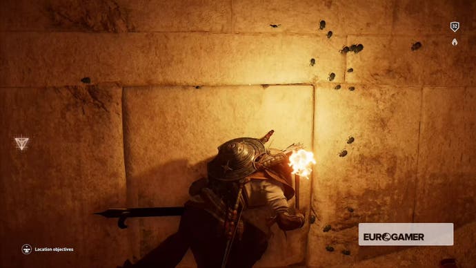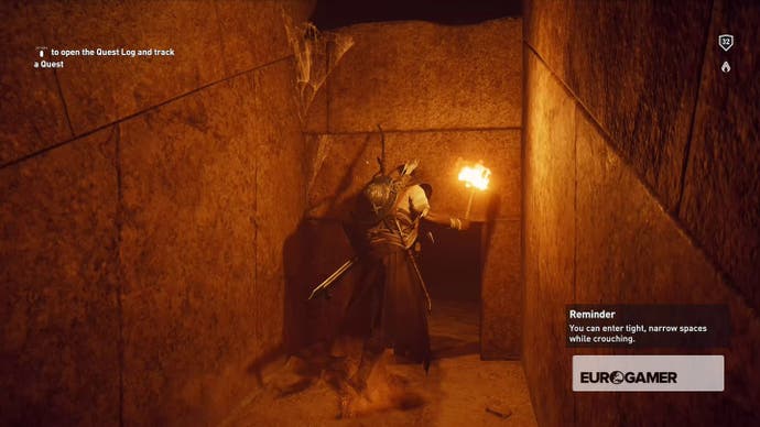 Gehen Sie hinein, bis Bayek darüber murmelt, dass es sich um eine Sackgasse handelt, und kriechen Sie dann durch das Loch in der Nische in der Ecke.