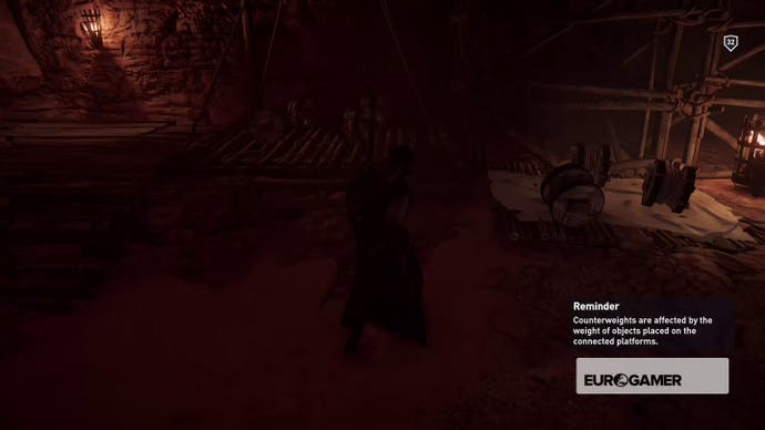 Ihr Ziel ist es, die untere Plattform in die Luft zu erhöhen und den anderen zu beschweren, um sie an Ort und Stelle zu halten. Entfernen Sie die Seilrollen von der unteren Plattform und klettern Sie dann auf das Gerüst auf die höhere Plattform. Sobald Ihr Gewicht es auf den Boden gezogen hat, bewegen Sie die Seilrollen darauf, um es zu beschweren.