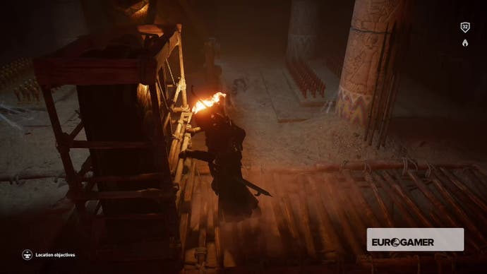 Wenn Sie die Eröffnungsbereiche durchlaufen, stoßen Sie auf einen kleinen Banditenwiderstand. Vermeiden Sie sie oder beseitigen Sie sie und folgen Sie dem Weg weiter, bis Sie einen Raum mit ein paar Holzplattformen erreichen, die von Seilen aufgehängt sind.