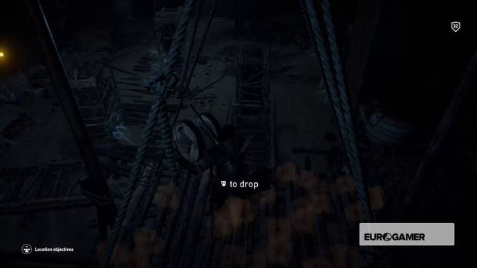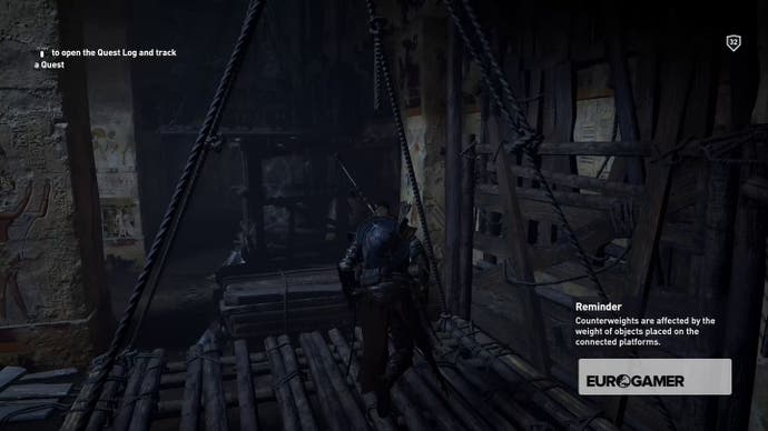 Im nächsten Raum klettern Sie auf die hängende Plattform zu Ihrer rechten und zerschlagen. Nehmen Sie die Seilrollen davon und tragen.