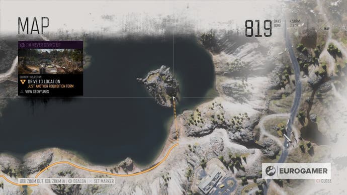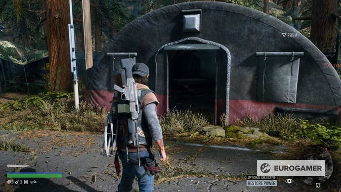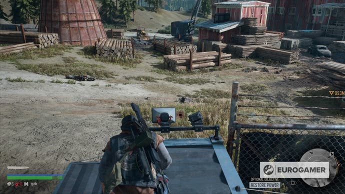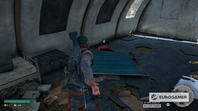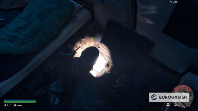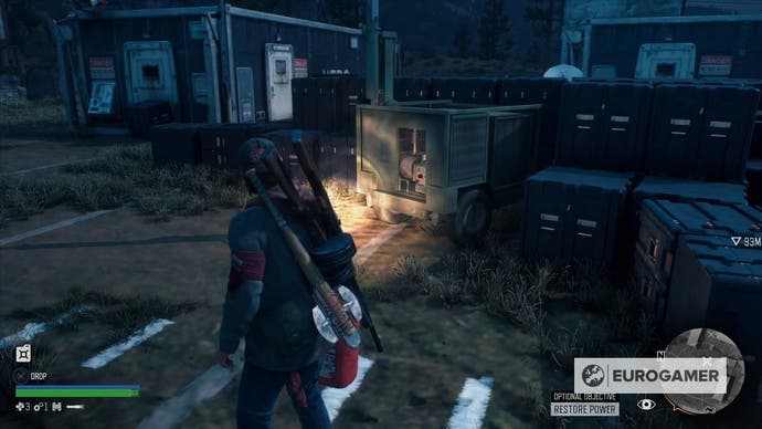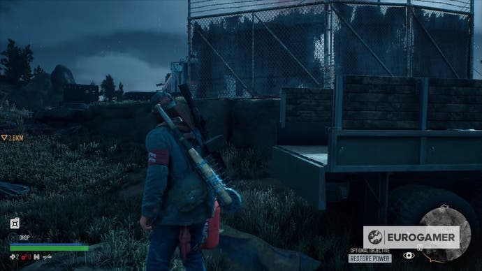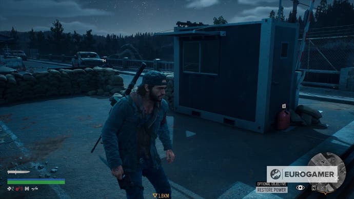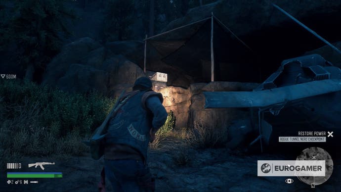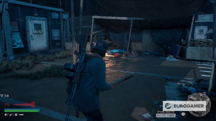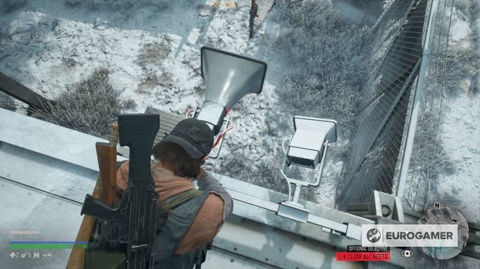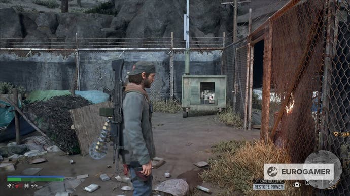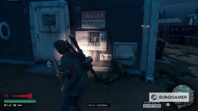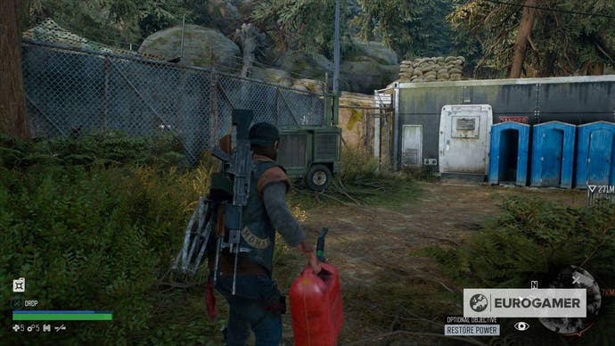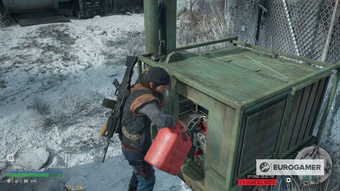 Im Inneren befindet sich der Generator, indem Sie von der rechten Seite des Ortes eingeben, da die Zauntür verschlossen ist. Wenn Sie zum großen Zelt links gehen, können Sie einen Gastank abholen. Sobald sich dies entschieden hat, stellen Sie sicher, dass ein Molotow bereit ist, da sich die fehlende Sicherung im Nest im Kontrollpunkt befindet. Schließlich gibt es nur zwei Redner, die auf dem Dach des Bunkers zu finden sind.