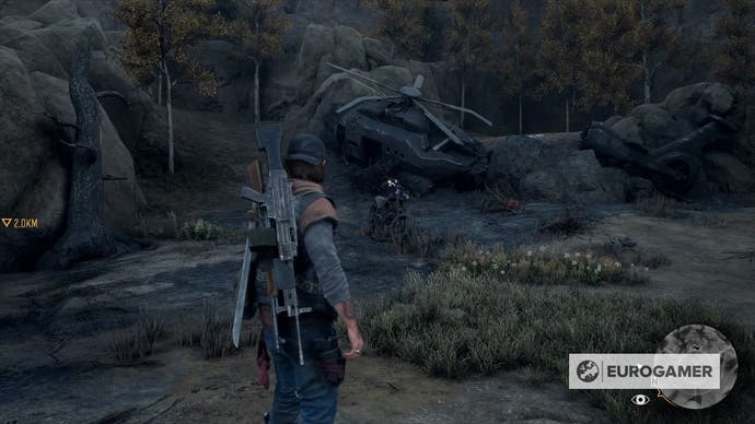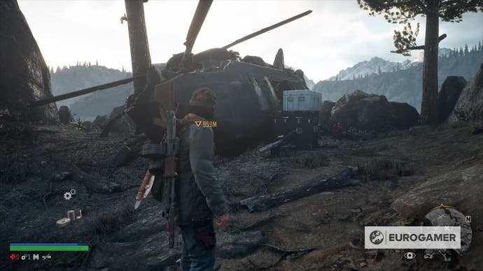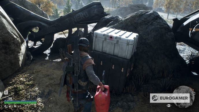 Sie sehen eine Absturzstelle mit Hubschraubern, und wenn Sie die Route nach rechts nehmen, wird sich ein Lagerfeuer sichtbar. Der Ort ist leer, also mach dir keine Sorgen um die Begegnung mit Feinden hier. Plündern Sie einfach alles dort und folgen Sie dem Pfad, bis sie noch einen dieser Koffer sehen und einen zusätzlichen Nero -Injektor tragen.