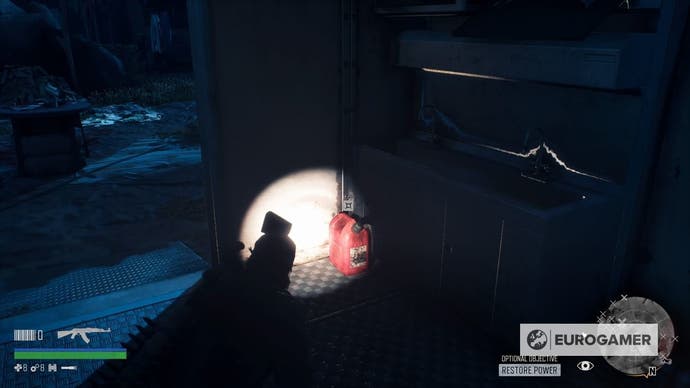 Es gibt zwei Gasdosen, aber die einfachste, die Sie abholen können, befindet sich in einer leeren MMU. Gehen Sie zum Generator, der ebenfalls verklemmt wird, und halten Sie immer wieder quadratisch, bis er aktiviert ist. Aber Überraschung! Du wirst auch eine Fackel brauchen.