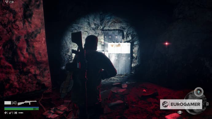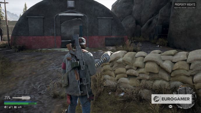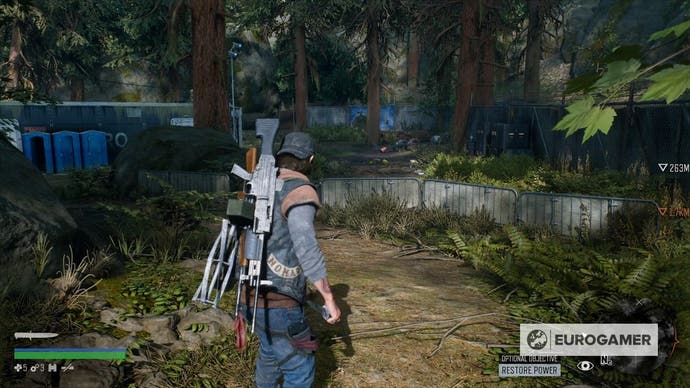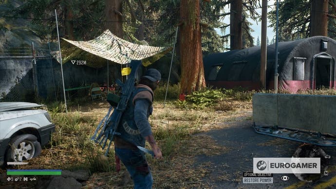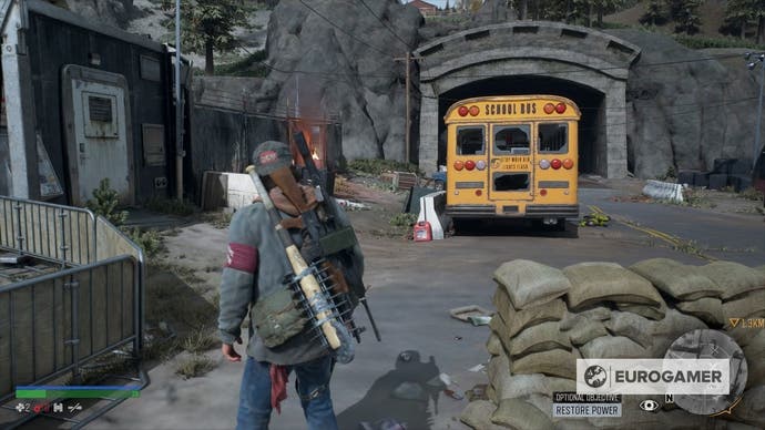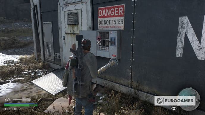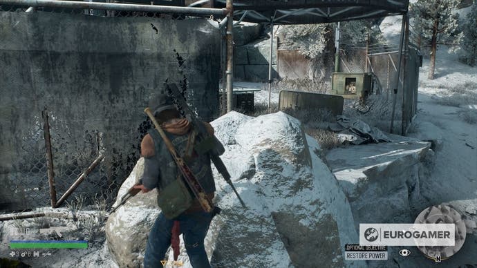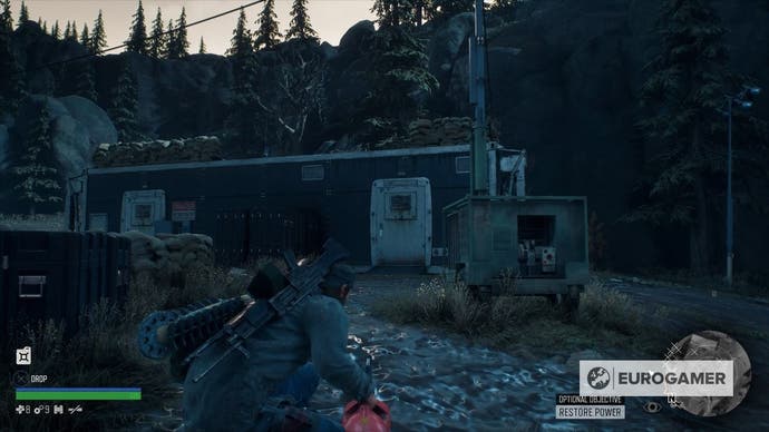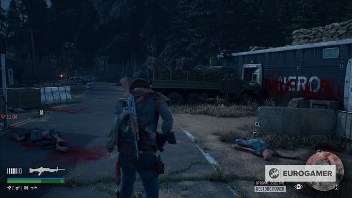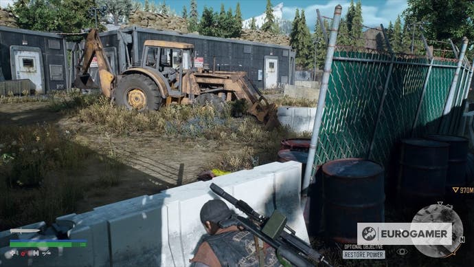 Gehen Sie zum Generator mitten auf der Straße und schalten Sie ihn ein, aber nehmen Sie zuerst alle Lautsprecher heraus. Überprüfen Sie die Linien der Bunker, da es mindestens fünf davon gibt, plus einen im verschlossenen Eingang, den Sie sehen können, um den Pfad zu blockieren. Es gibt keine Möglichkeit zu klettern, also schießen Sie es einfach.