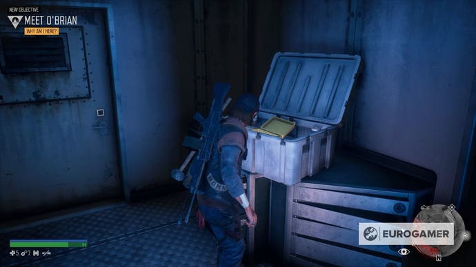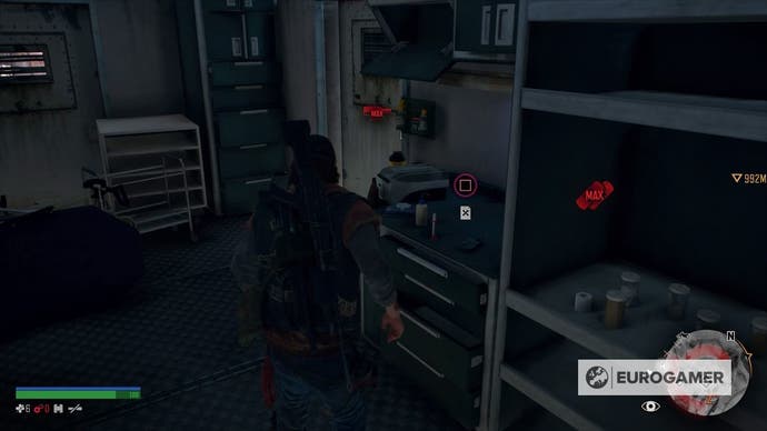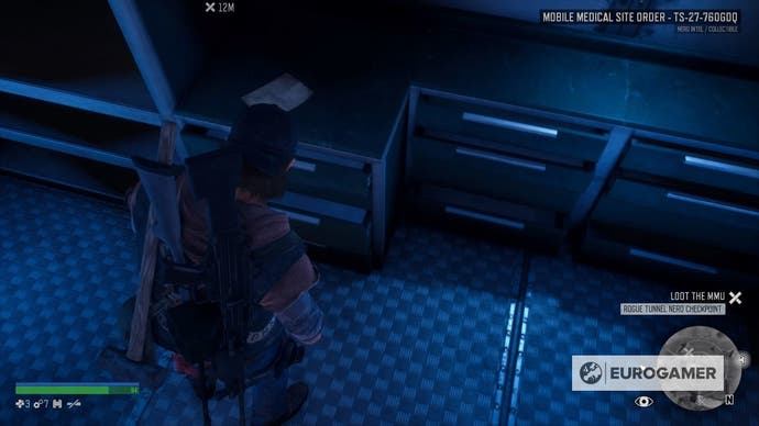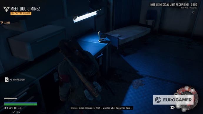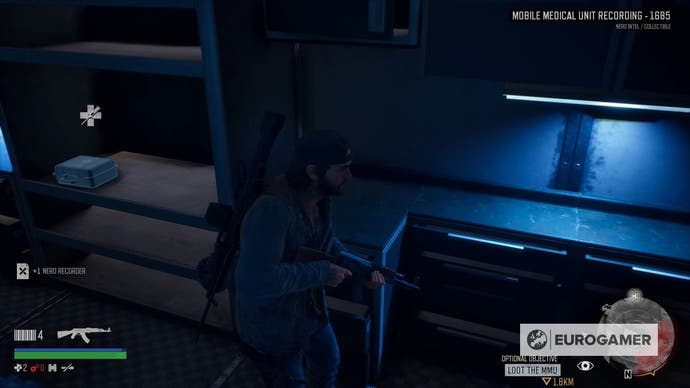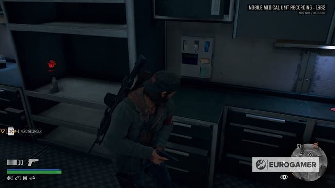 Laden Sie den Generator auf, klettern Sie auf das Dach und kümmern Sie sich um die beiden Lautsprecher dort. Fühlen Sie sich nun frei, es zu aktivieren. Im Inneren, zusammen mit einem anderen Nero -Injektor und einigen Vorräten, finden Sie die Mobile Medical United Recording – 1111.