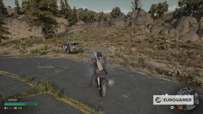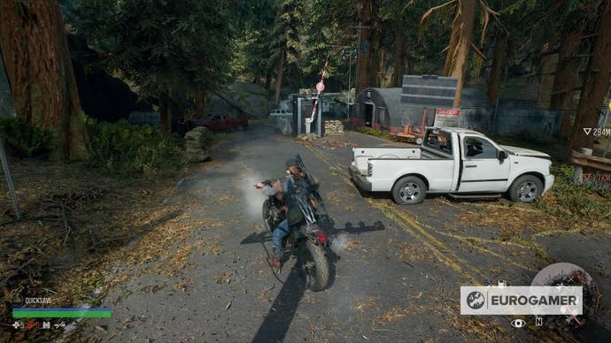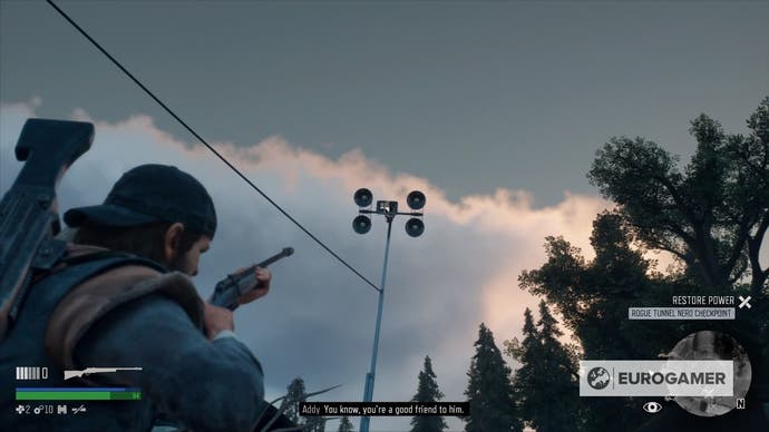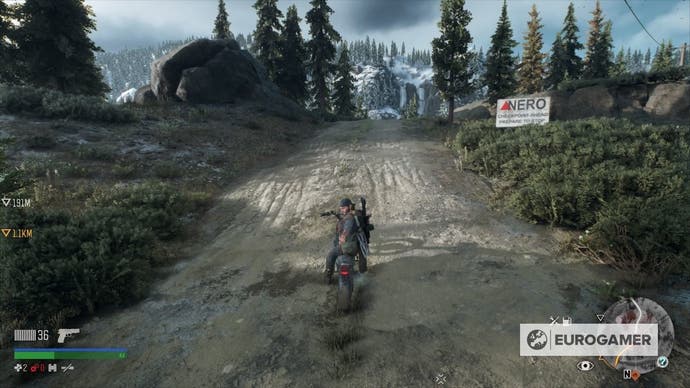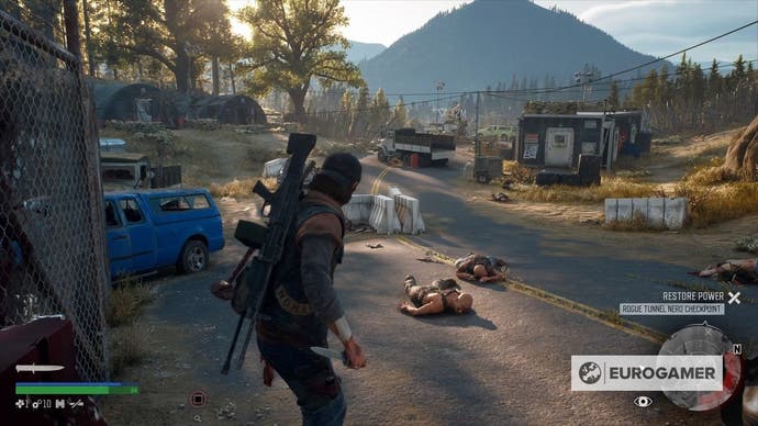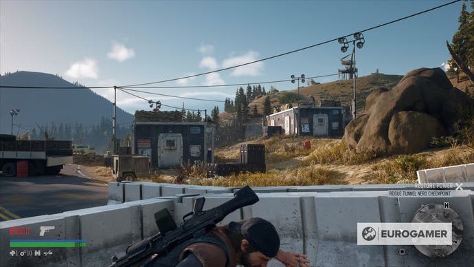 Zumindest befindet sich der letzte Nero -Checkpoint auch auf dem Highway 97. Dieser ist einfach, aber hier gibt es etwas mit den Lautsprechern. Es gibt eine Horde sehr nahe an der Gegend, und einige von ihnen sind an leichte Töpfe gebunden. Sie können sich entweder selbst riskieren, indem Sie sie abschießen oder sie als Ablenkung lassen.