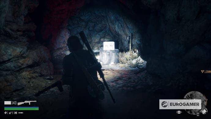Folgen Sie es durch den Weg bis zum offenen Feld und gehen Sie zur linken Seite. Sie werden einen riesigen Generator zusammen mit einigen Vorräten sehen. Mach weiter, bis du in einer Höhle bist.
