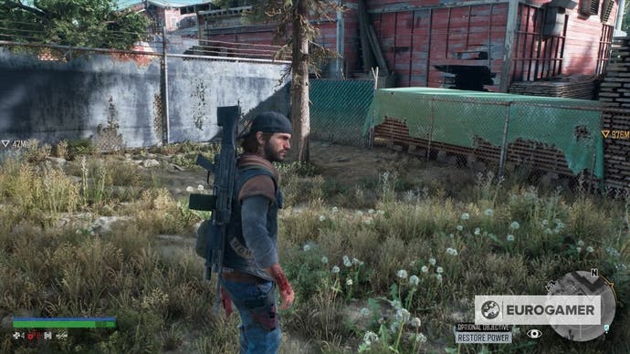 Gehen Sie zurück zur Tendenz und bewegen Sie sich bis zum Hinterhof überall. Vorsicht, da es (zumindest tagsüber) eine Gruppe von Feinden auf der anderen Seite gibt. Aber es gibt einen bequem platzierten Gastank auf der Seite, also schieße einfach und es wird die meisten von ihnen erfordern.