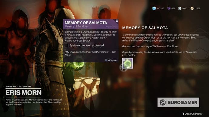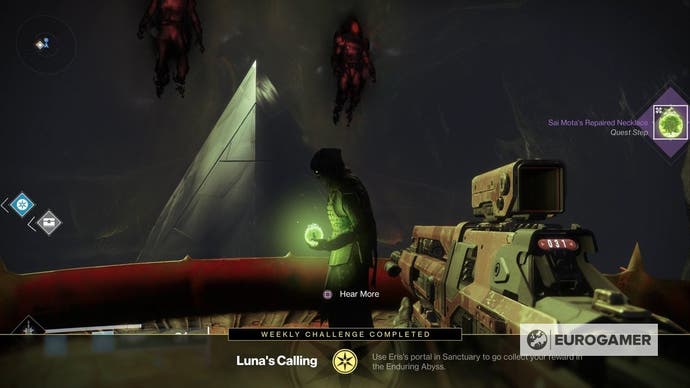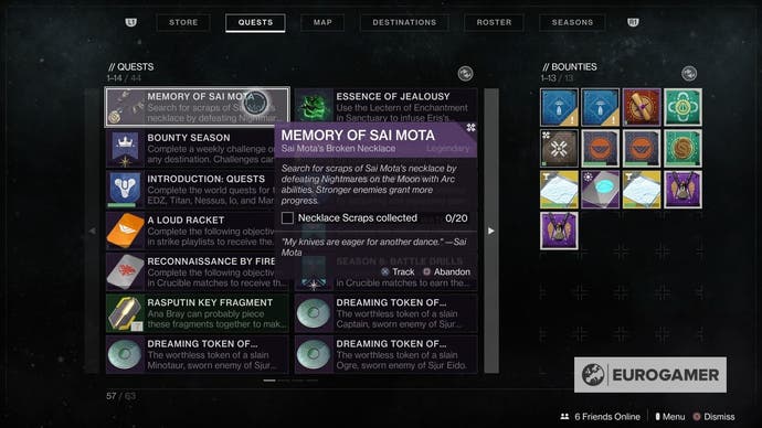 Das Wichtigste zuerst – vervollständige die Destiny 2 Shadowkeep -Kampagne. Dies endet in der Beyond Mission, und sobald es abgeschlossen ist, werden Sie die Erinnerung an Sai Mota Quest erhalten.