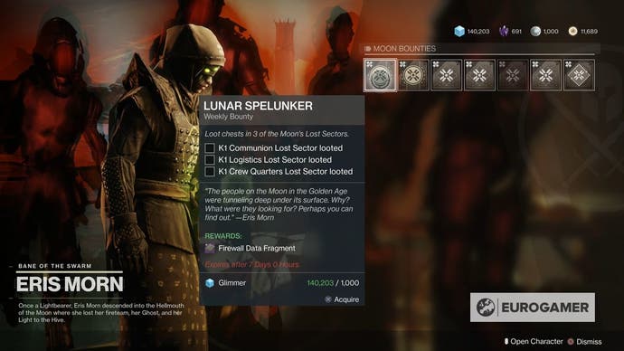 Um dies zu vervollständigen, nehmen Sie den Mond Spelunker Weekly Bounty von Eris ‚Kopfgeldliste ab. Mit der Mond Spelunker Bounty haben Sie die K1 -Kommunion, K1 Logistics und K1 Crew Quarters abgeschlossen Verlorene Sektoren. Sobald Sie es getan haben, Hand in der Kopfgeld.