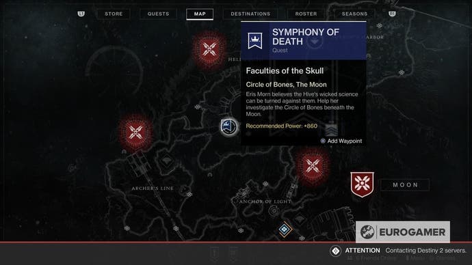 Sie werden jetzt die Symphonie des Todes für exotische Quest -Zeile beginnen. Der erste Schritt ist „Circle of Bones Explored“, einem Bereich, der tief unterirdisch im Mond ist.