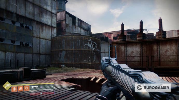 Springen Sie von hier aus auf das Gebäude geradeaus und schauen Sie nach Nordwesten. Sie werden in der Ecke einen großen runden Silo sehen.