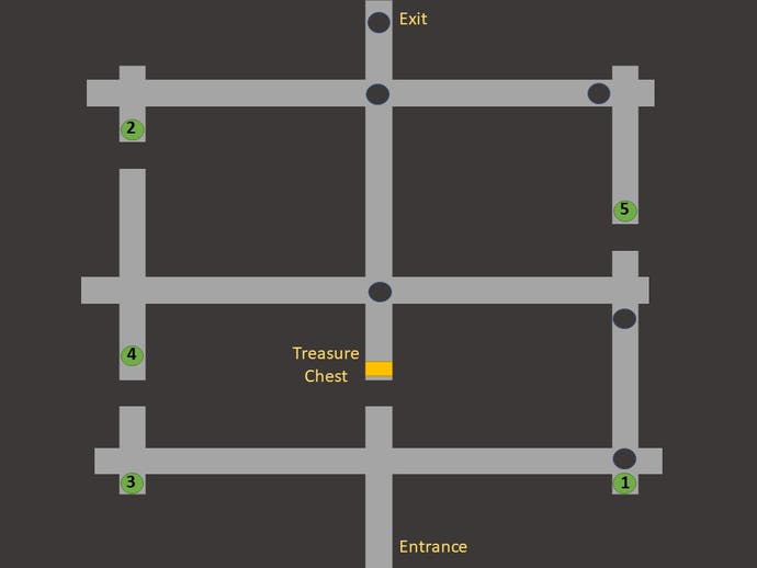 Wenn die letzte Person in Position ist, können Sie in einer bestimmten Reihenfolge die Brusttür öffnen, um auf Teller zu treten. Diese Sequenz basiert auf dem Standort relativ zum Beginn des Labyrinths::