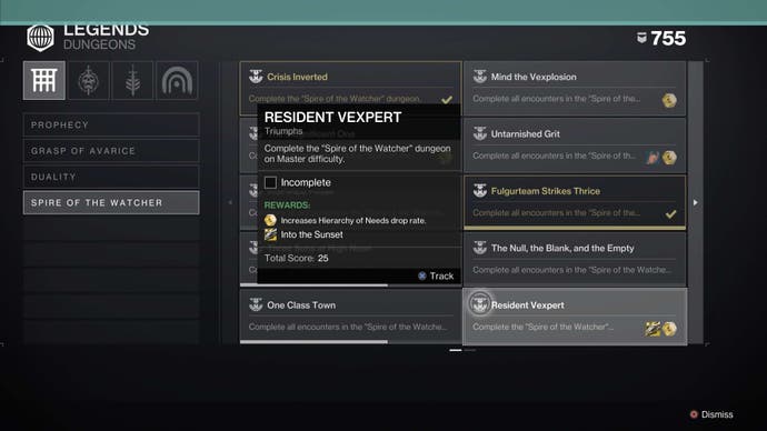 Viele der Triumphe für Spire of the Watcher Grant Triumph erzielen mit einem Paar zusätzliche Belohnungen wie die ‘In den Sonnenuntergang’ Spatz – über die erworben ‘Einwohner Vexpert’ Triumph – und das ‘Flug von Soteria’ Emblem für die Fertigstellung des ‘Ungetrügerte Grit’ Triumph.