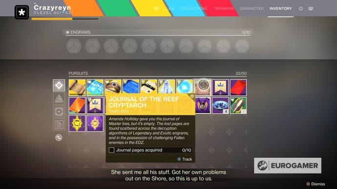 - Vervollständigen Sie das Journal der Reef Cryptarch Quest -Linie, wann immer es verfügbar ist, z