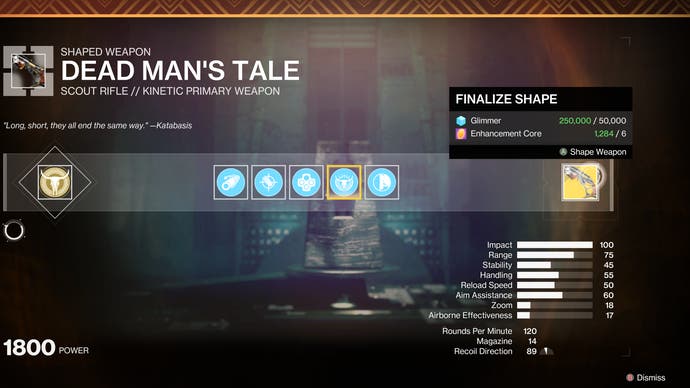 Dead Man’s Tale ist ein Scout -Gewehr mit hohem Impact. Seine Aufgabe ist es, in ihren schwachen Bereichen die einzelnen Ziele hart und schnell zu treffen, und es ist äußerst effektiv, wenn Sie damit gut feuern können.