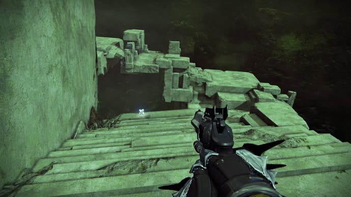 Gehen Sie am äußeren Rand der Karte entlang, bis Sie einen offenen Bereich mit einem Obelisken auf einem Sockel finden (der eine schwere Munitionslagung dahinter verbirgt). Auf der gegenüberliegenden Seite dieses Bereichs befindet sich der Geist auf dem Boden.