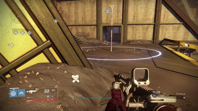 In der Mitte der Karte befindet sich ein Raum, in dem Wege von allen drei Wegen Kontrolle Punkte konvergieren auf einer oberen Ebene (von hier aus führen Türen, die zu Gegenteil führen Kontrollieren Sie Punkte, eine breite Tür nach draußen und ein Felsvorsprung, um darunter zu fallen). In der Mitte ist eine einsame Kiste mit dem Geist im Inneren.