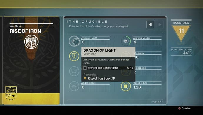 Wenn das Eisenbanner Event rollt herum – einmal alle vier bis sechs Wochen, ab Oktober – wird es mit seinem eigenen Ruf kommen, der jedes Mal zurückgesetzt wird. Holen Sie sich innerhalb eines dieser Ereignisse zu Rang fünf, um diesen Meilenstein zu vervollständigen. Dies sind ungefähr 30 Spiele für Spielzeit – abhängig von Ihrem Qualifikationsniveau – was dank des Abbruchs der Temperaturen und der Buffs, die in den vergangenen Jahren zu sehen sindmaximaler Rang unabhängig von der Leistung. Unser Blick auf alles Neue im Eisenbanner Erklärt, wie man sich dem zeitgesteuerten Ereignis am besten nähert.